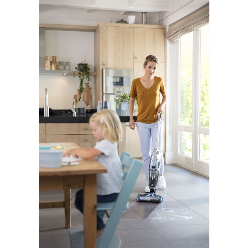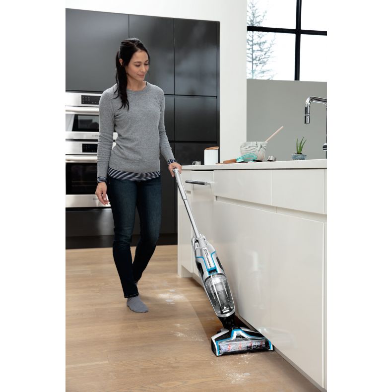 A BISSELL 3 az 1-ben CrossWave TM vezeték nélküli tisztítóeszközzel megszabadulhat a vezetékek és zsinórok korlátozásaitól. Ideális rendszeres, rutinszerű takarításhoz, valamint olyan bepiszkolódásokhoz, amelyek egyszerűen egy aktív család otthonában történnek. A 25 perces folyamatos üzemidő lehetővé teszi több helyiség és padlótípus egyidejű porszívózását, mosását és szárítását egy átlagos méretű házban.