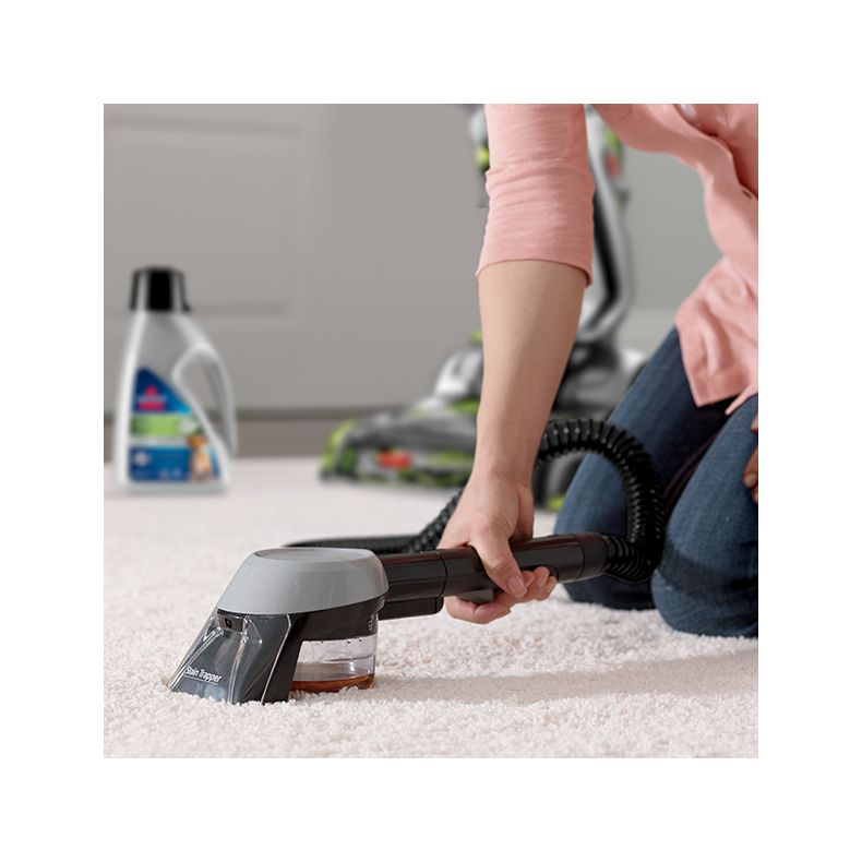 Helyezze az eszközt közvetlenül a eltávolítandó folt fölé, és húzza meg a kioldógombot, hogy a formula és a víz keverékét a foltra permetezze. Engedje el a kioldógombot, és óvatosan dörzsölje át a foltot a kefe-sörtékkel a tökéletes tisztítás érdekében. Az eszköz a begyűjtött törmeléket egy belső, különálló és eltávolítható szennyeződés-tartályban tárolja. Így könnyen üríthető, csak a szennyeződés-tartályt kell kidobni. A kosz nem marad a csőben vagy a gépben, így könnyen tisztán tartható.