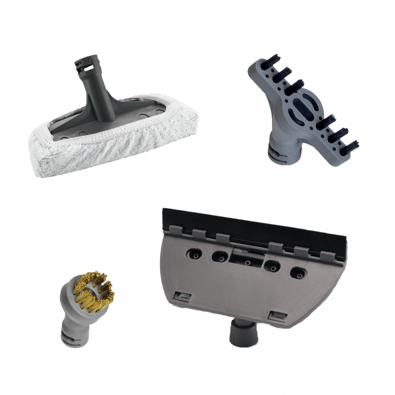 A kiegészítők segítenek az ablakok megtisztításában, a ruhák és függönyök kivasalásában, a tűzhelyrácsok megtisztításában, mindezt a gőz erejével!